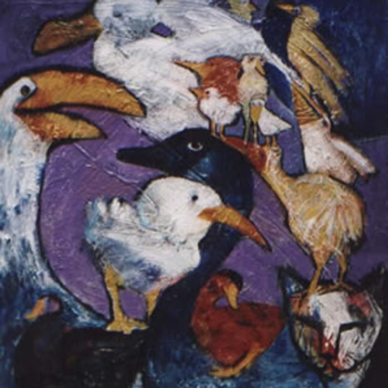 Chica Brunsvold’s manner of envisioning menageries from textures creates a whimsical, ideal fantasy of a peaceable kingdom, with metaphorical commentary on the human condition. In Birdlam, an array of birds hatches from a bountiful nest in bewildering profusion. In Enchanted Evening, a large black cat nearly embodies a night in which other cats symbolically bear birds on their backs as in a rite of moon worship. In Waiting II cats and birds again congregate, with the cats appearing to watch over the cranes. Chit Chat and Limbo feature exuberant and crowded congregations of bird species ranging from cranes to toucans. Each of Brunsvold’s works is characterized by a different dramatic energy, derived from the membership and number of the grouping.